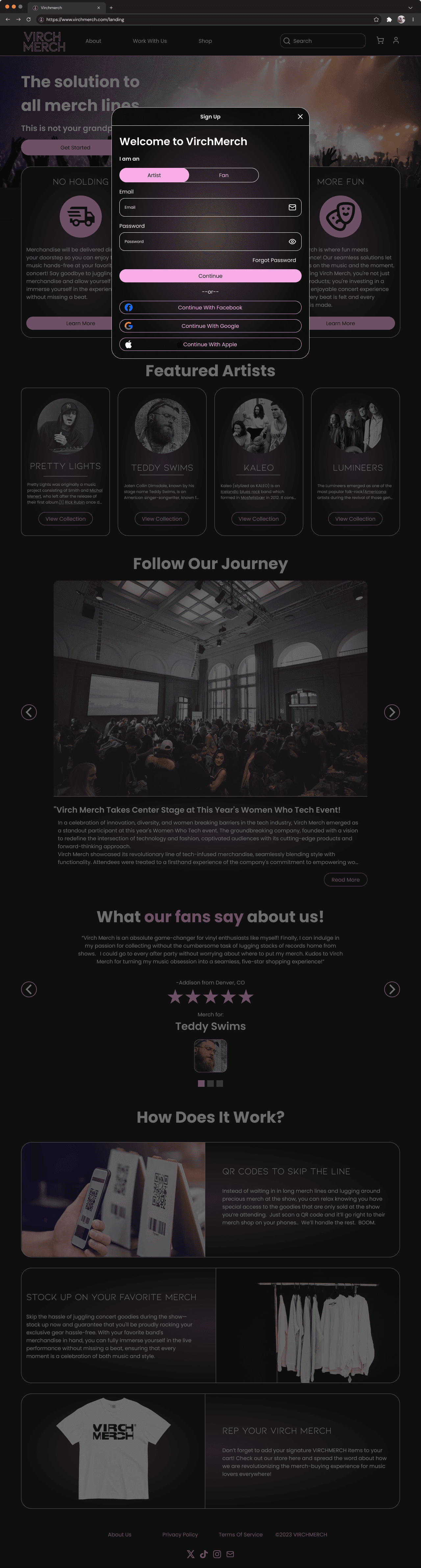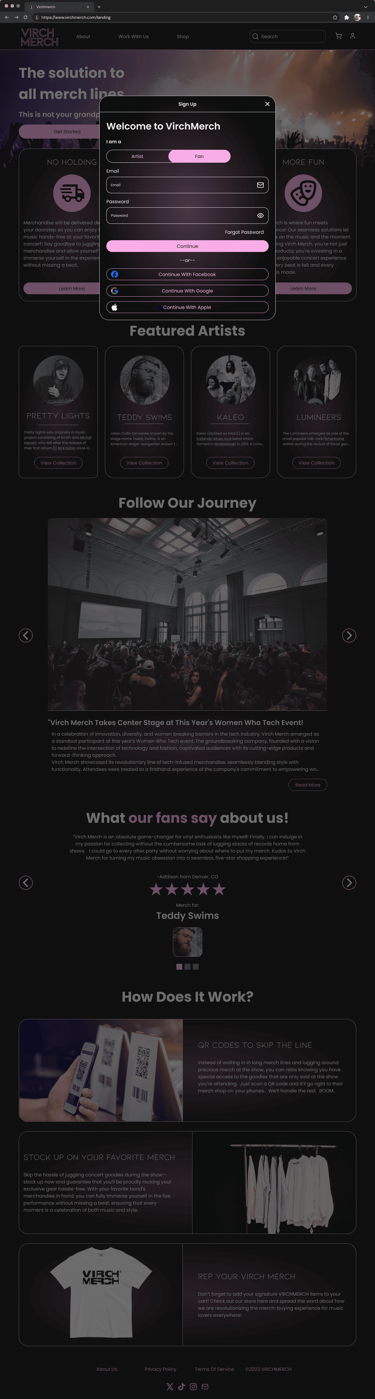 Below is Virch Merch's original website and style guides. This iteration lacked key elements, like a CTA for the landing page, the ability to create an account as either an artist or a fan, and a brand identity that fit the vision Virch Merch had:
