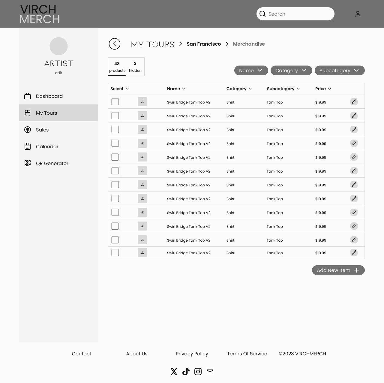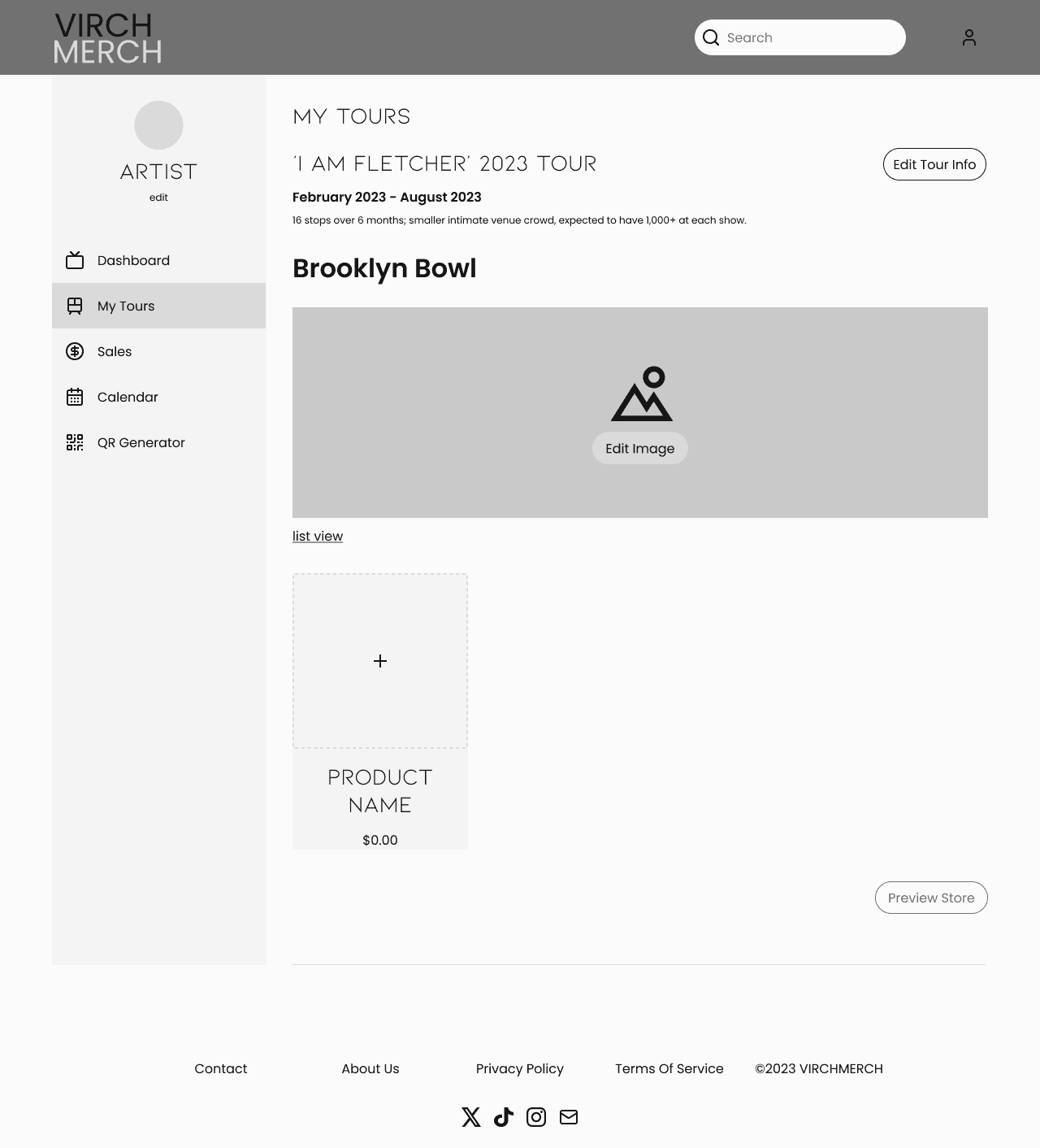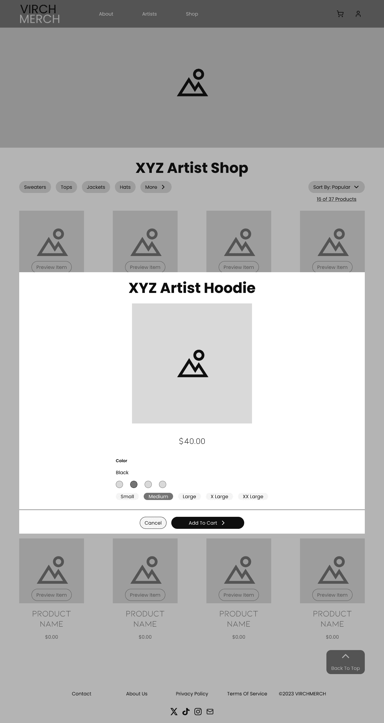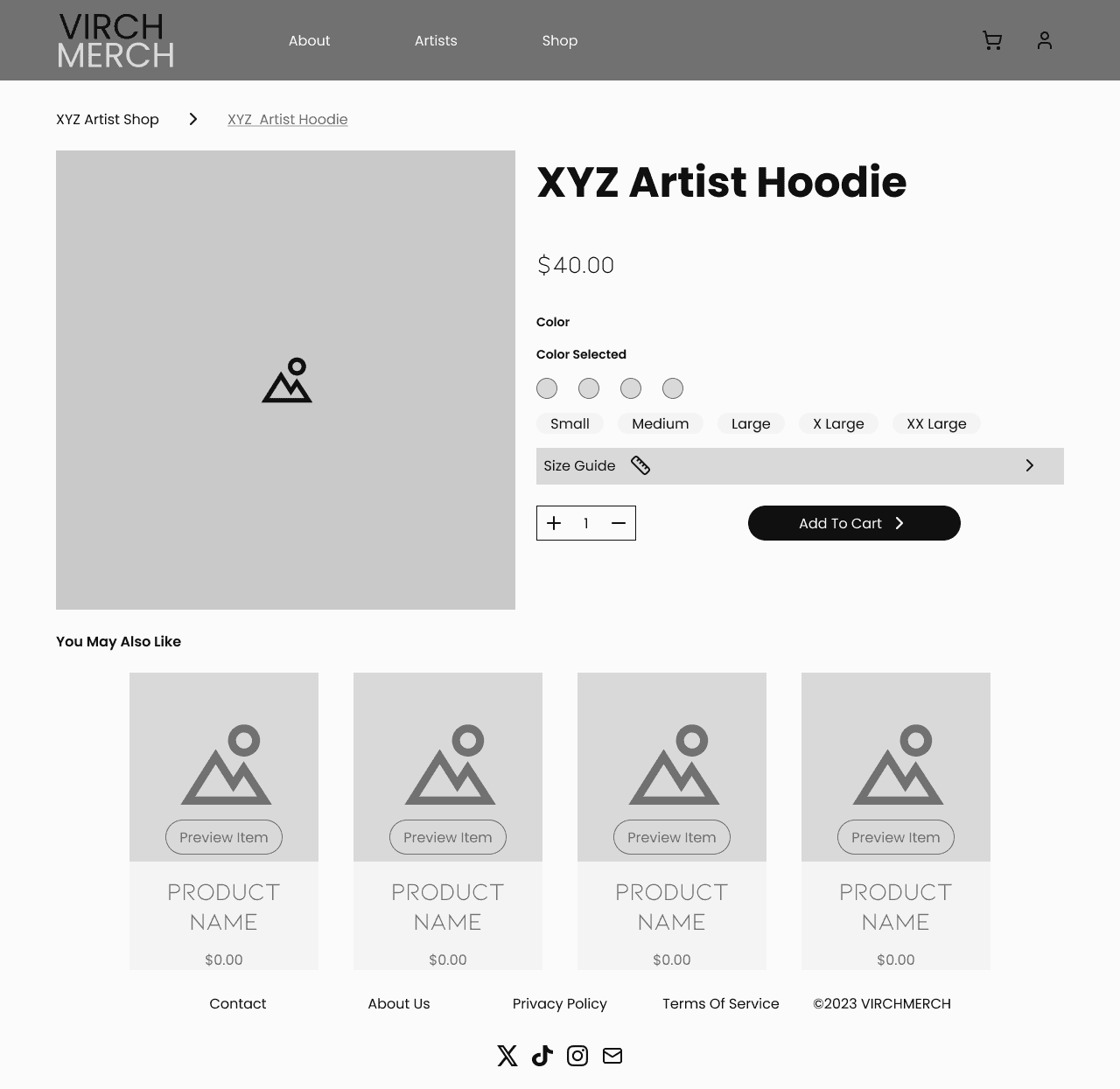Store items typically were presented in a digestible grid format, usually about 4 in a row with no fluff or clutter. Virch Merch needed to emulate this simplicity to increase artist merchandise sales
