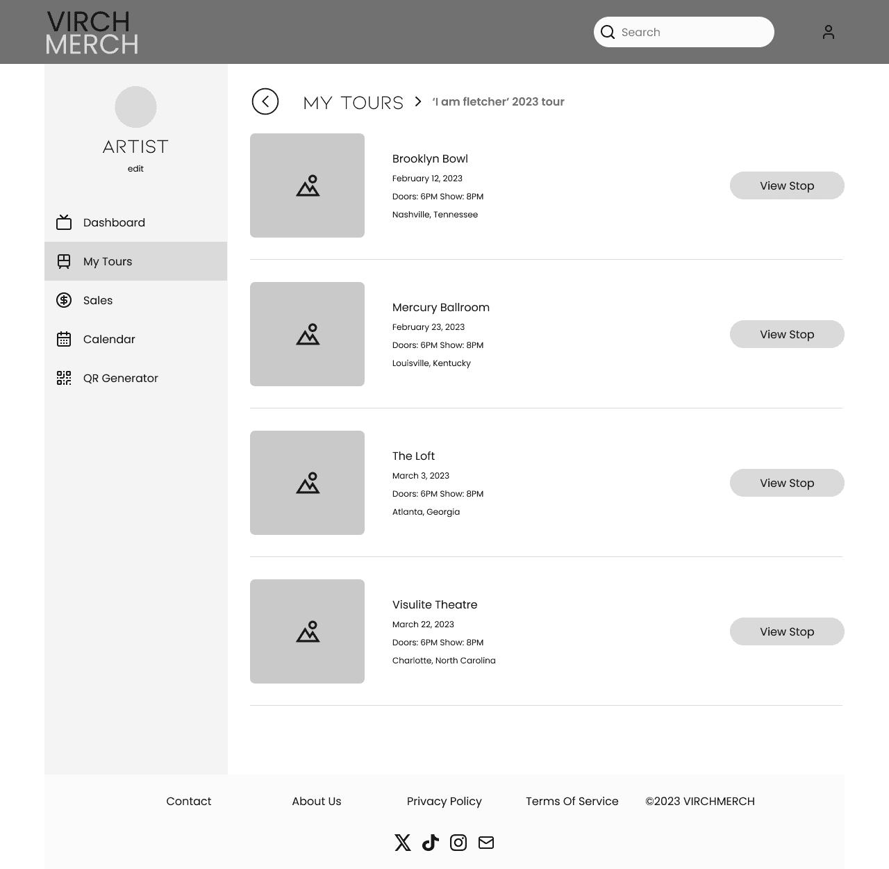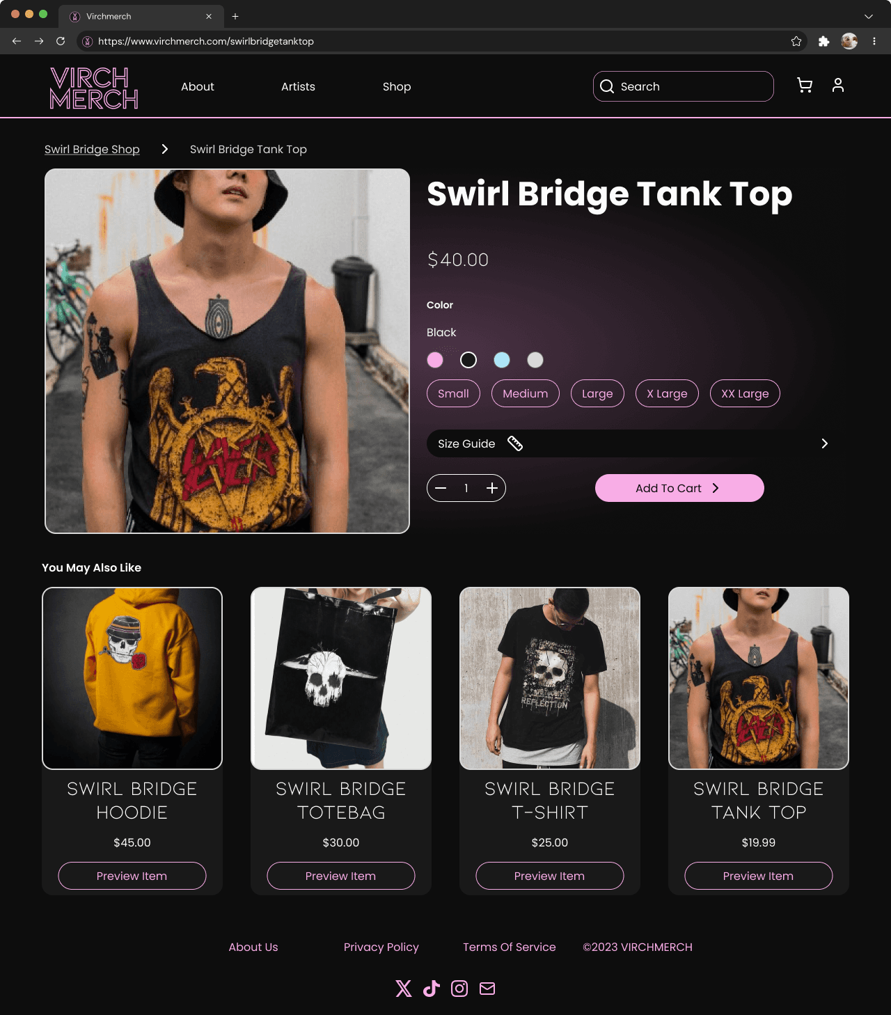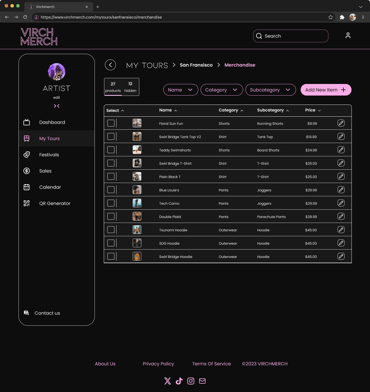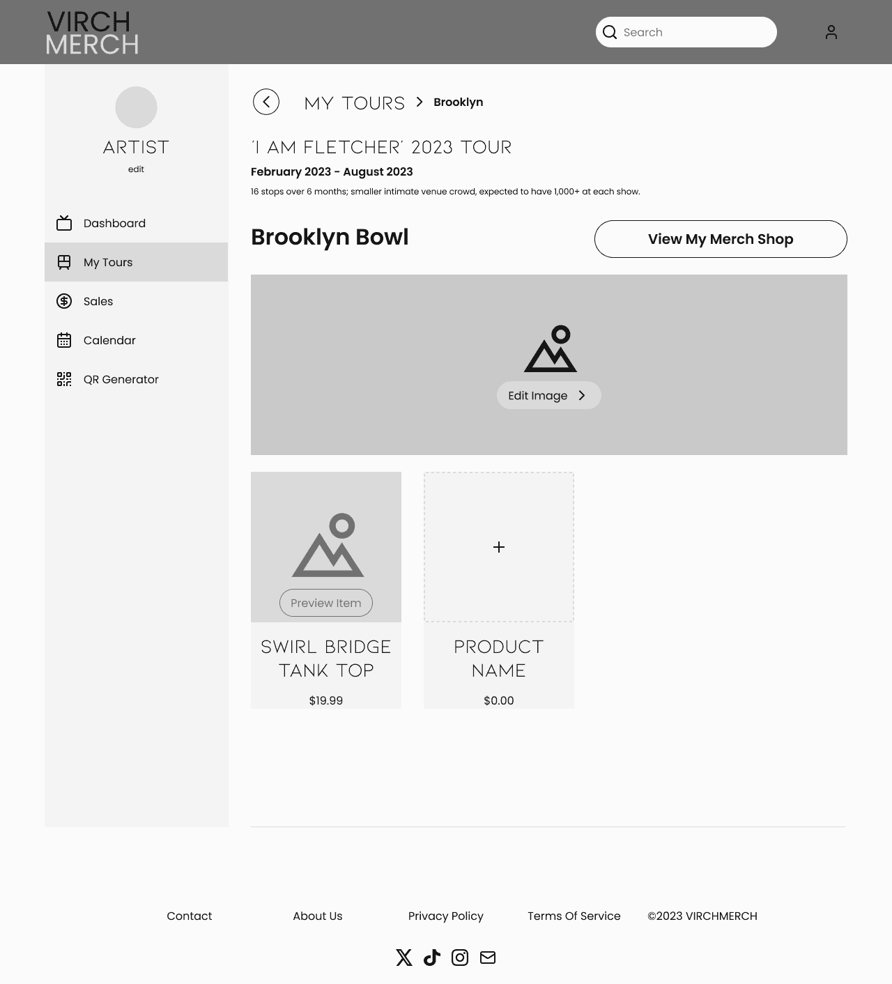 Store items typically were presented in a digestible grid format, usually about 4 in a row with no fluff or clutter. Virch Merch needed to emulate this simplicity to increase artist merchandise sales