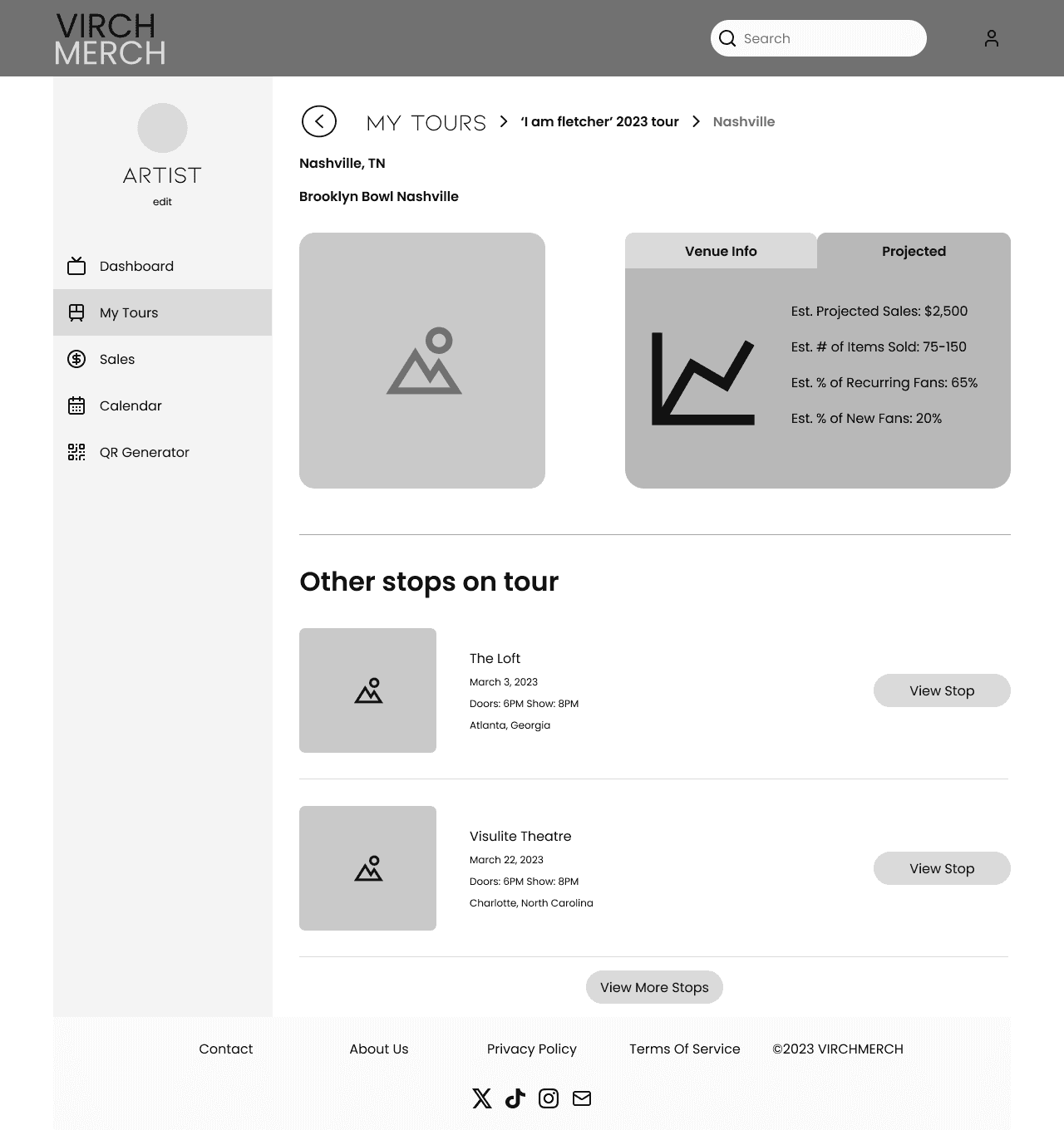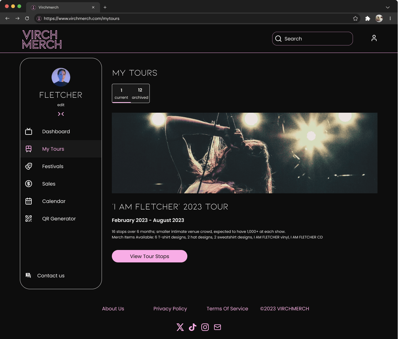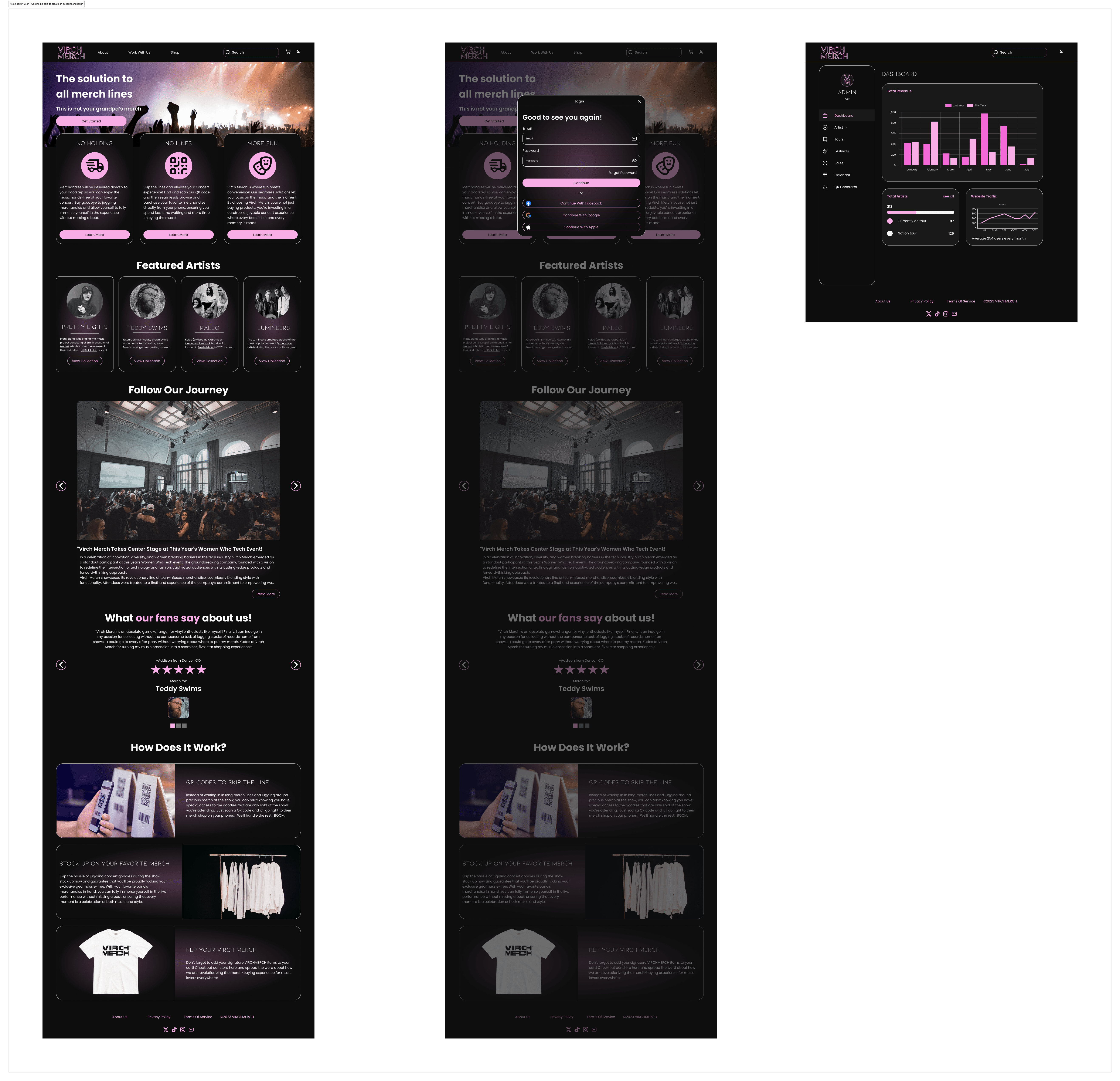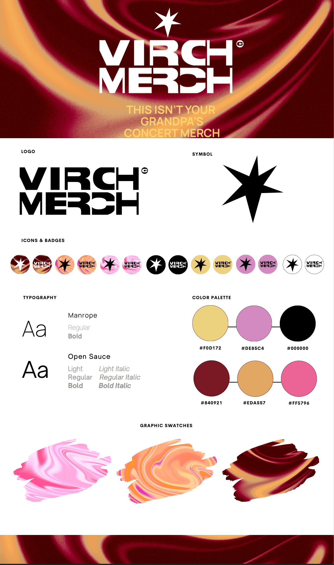 When it comes to live concerts, selling merchandise can pose a challenge to musicians who find themselves over or underspending on items that don't sell to their expectations, leading to lost revenue. Virch Merch aims to mitigate artist losses and give customers a more streamlined experience, but the current website didn’t have the full functionality they were promising: allowing fans to buy merchandise during shows, and artists to set up their shops. They also needed to cater to the concert scene as a whole, by presenting themselves with a more exciting and groundbreaking brand identity.