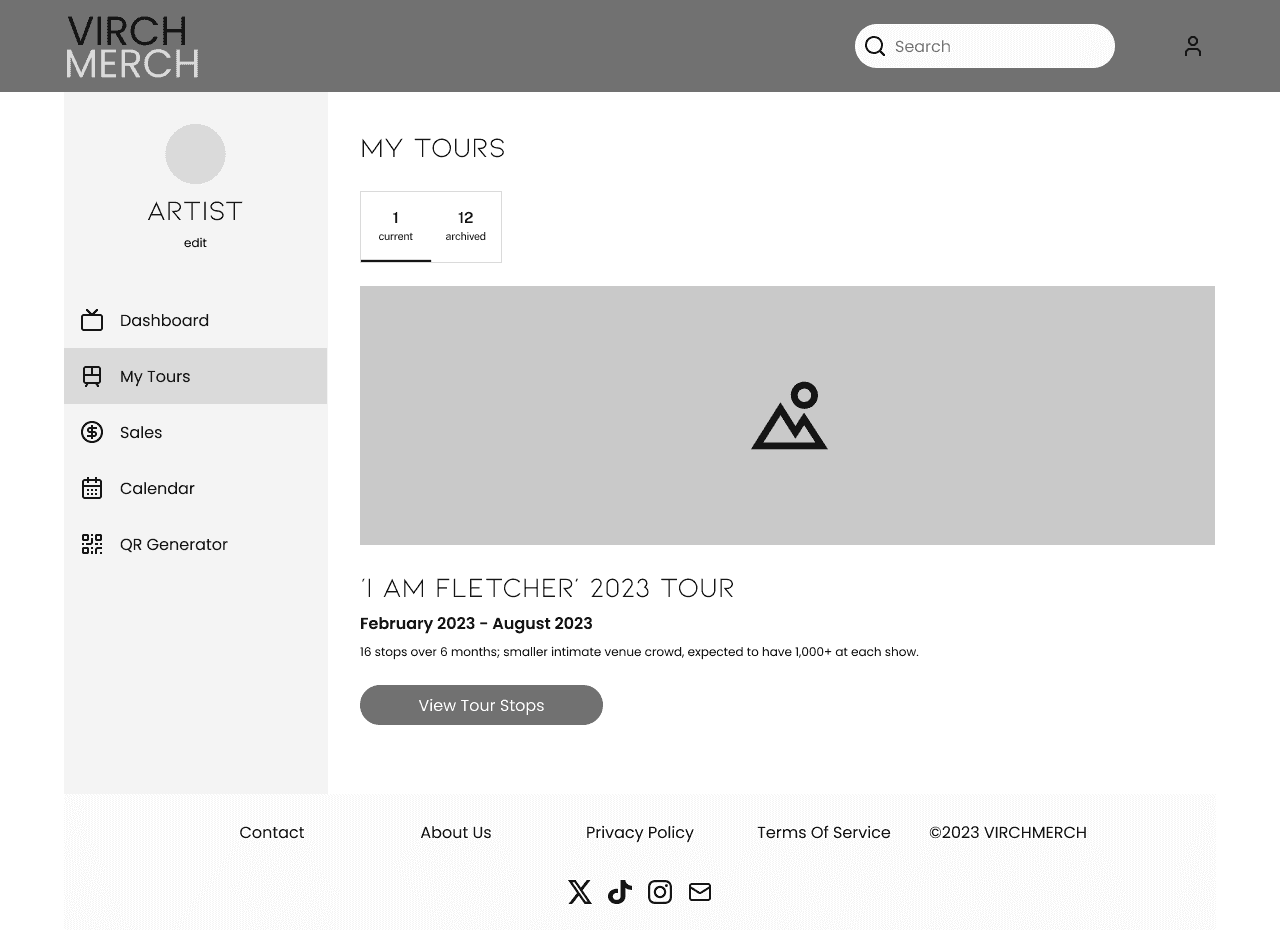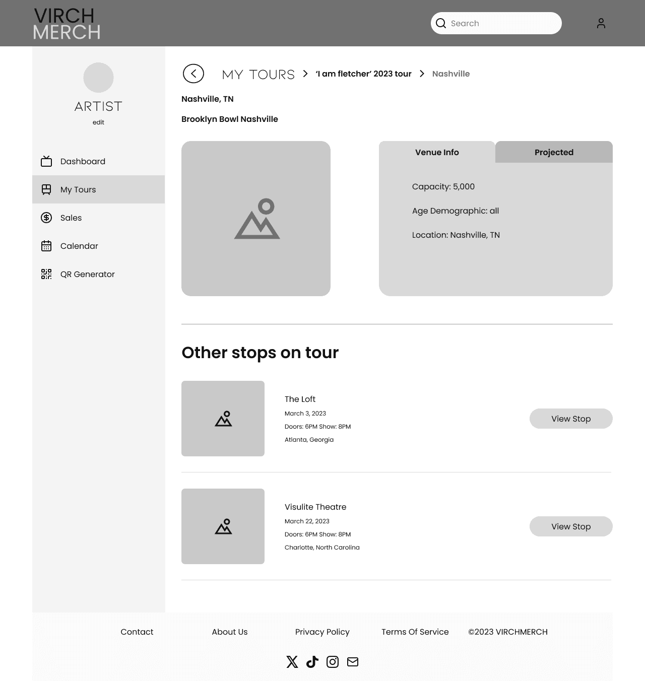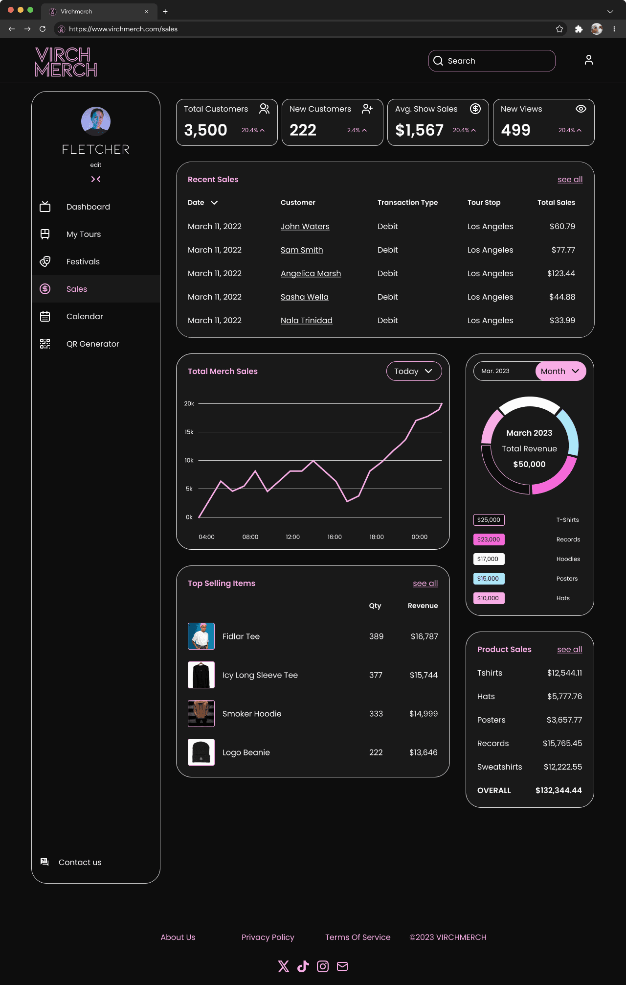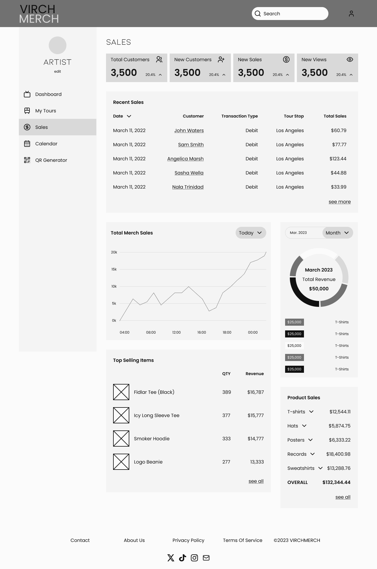 When it comes to live concerts, selling merchandise can pose a challenge to musicians who find themselves over or underspending on items that don't sell to their expectations, leading to lost revenue. Virch Merch aims to mitigate artist losses and give customers a more streamlined experience, but the current website didn’t have the full functionality they were promising: allowing fans to buy merchandise during shows, and artists to set up their shops. They also needed to cater to the concert scene as a whole, by presenting themselves with a more exciting and groundbreaking brand identity.
