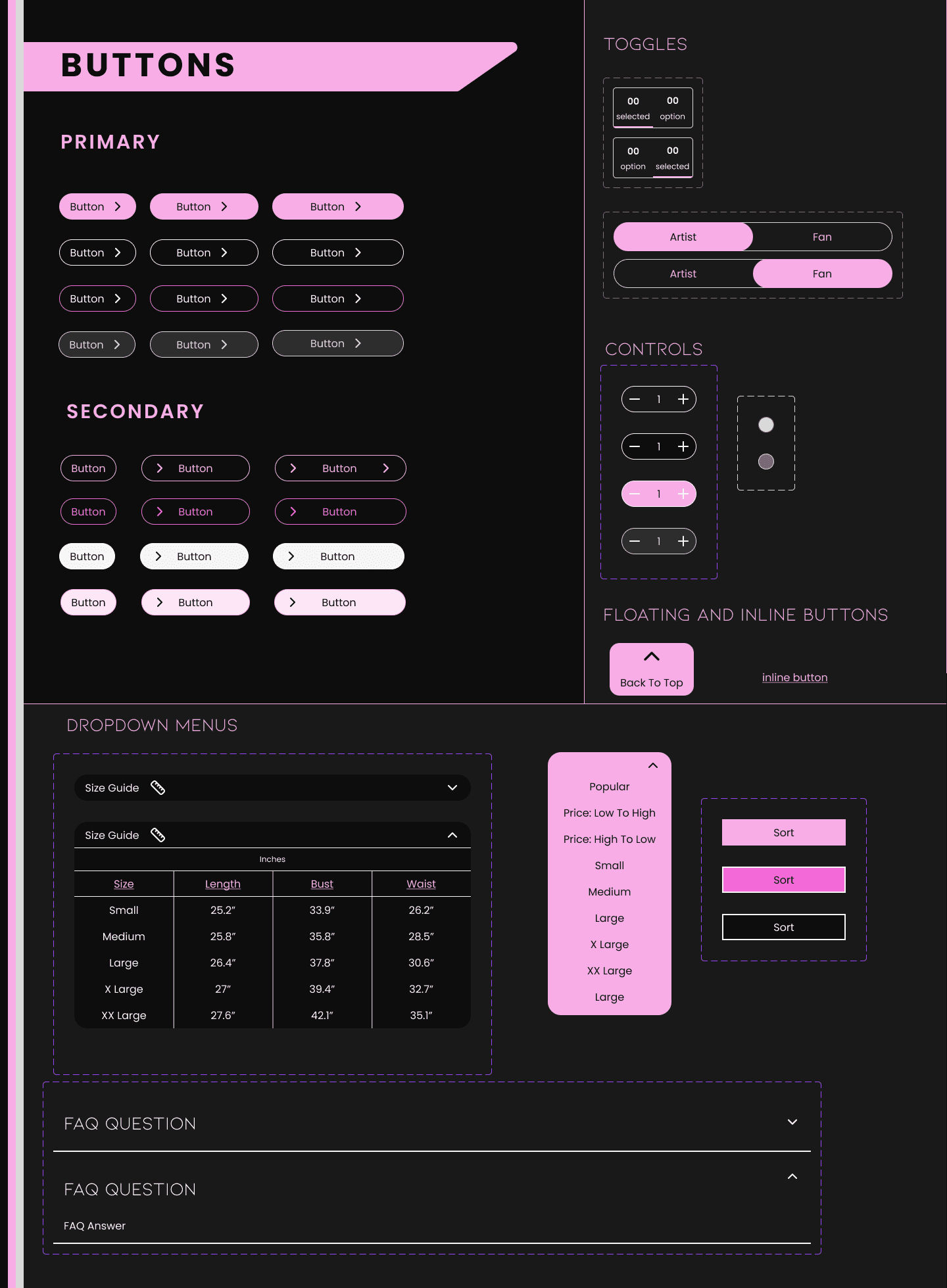 I designed another dropdown menu for the About page's FAQ, and the individual product page's size guide. It can be tricky to create a dropdown because you have to be mindful of if and how it should affect the contents around it-- while the About page was fairly simple, many size guides are built as pop-ups in similar product page layouts. I opted to make it a dropdown though, because a pop-up could frustrate users trying to make an on-the-spot purchase, and the size dropdown is not very long or obtrusive.