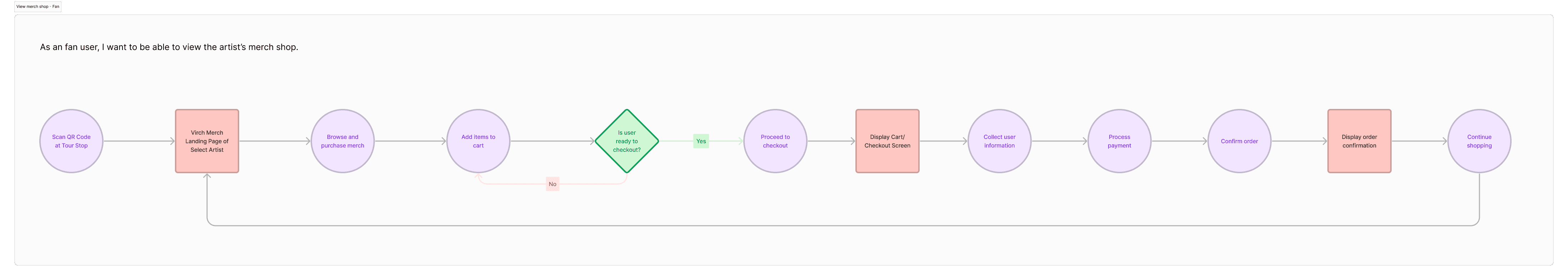 After getting additional context from our client, it was time to move on to competitive analysis to determine how Virch Merch compared to similar services. Many similar e-commerce websites would only be practical to browse at home, after or before the event. Virch Merch stands out as being an online platform built for fans to buy concert merchandise while at the event, so the same metrics for success competitors had would not entirely apply. Because of its unique concept, however, studying these platforms was crucial to ensure we designed while keeping in line with market familiarity. This would allow new users to easily jump in from another site and get to know Virch Merch's system.
