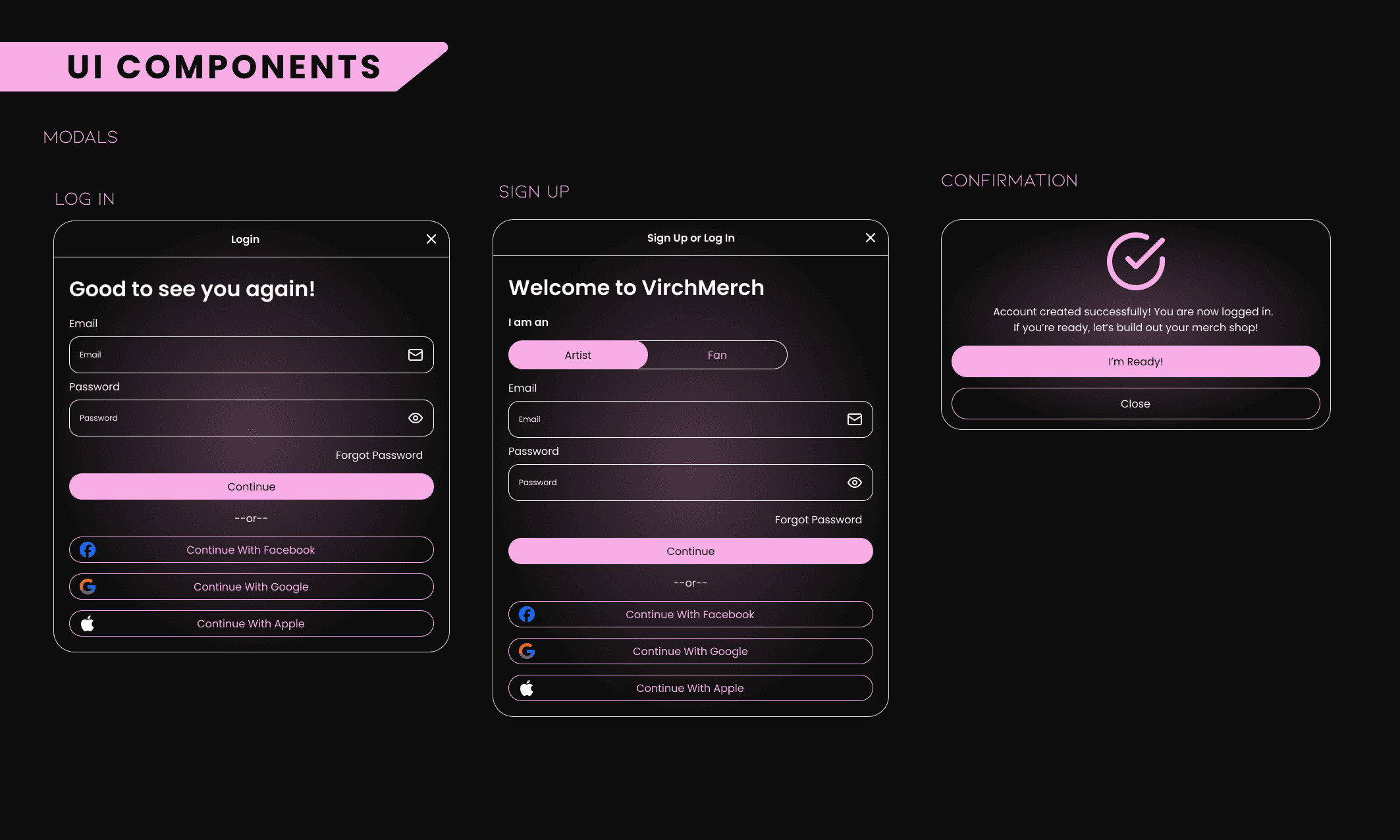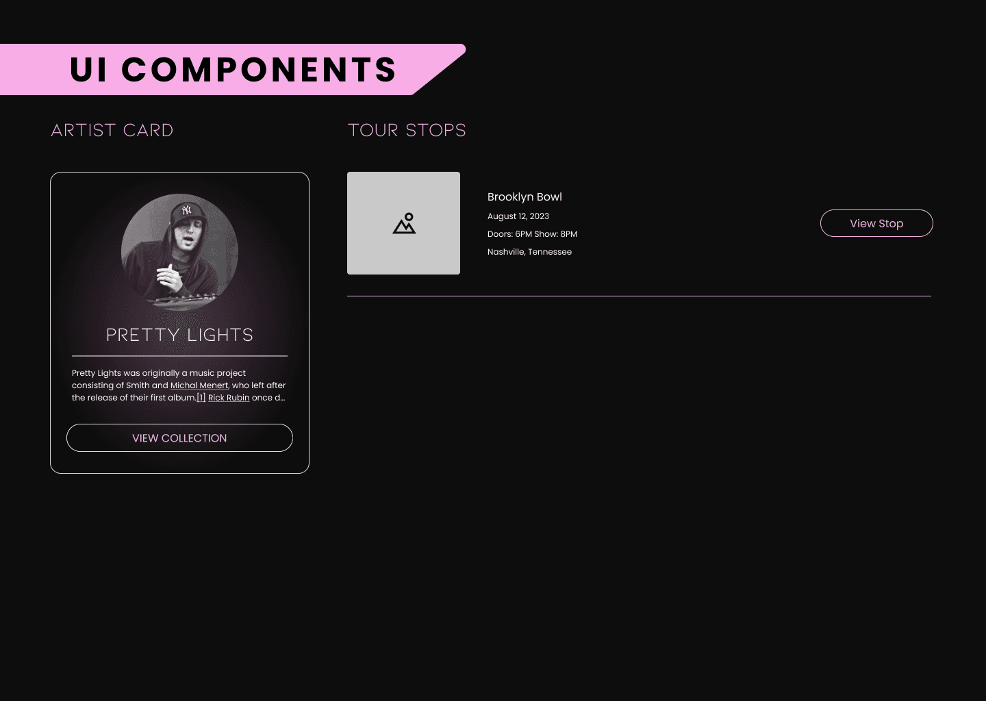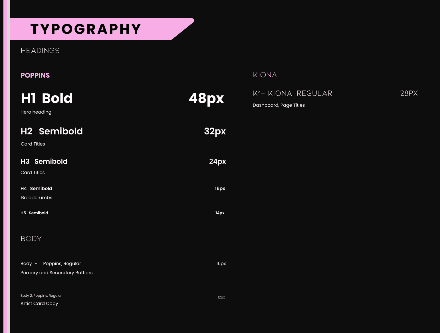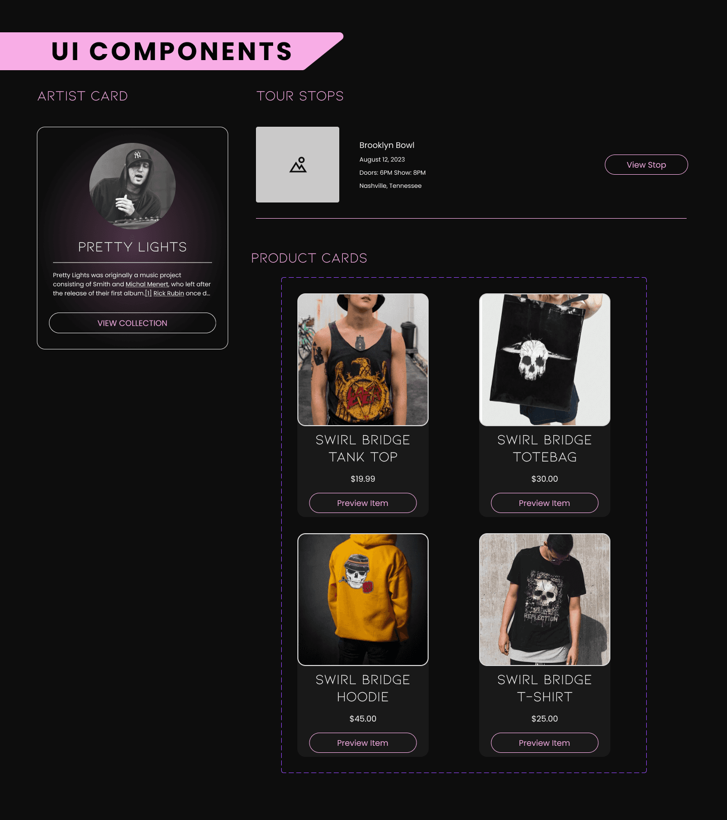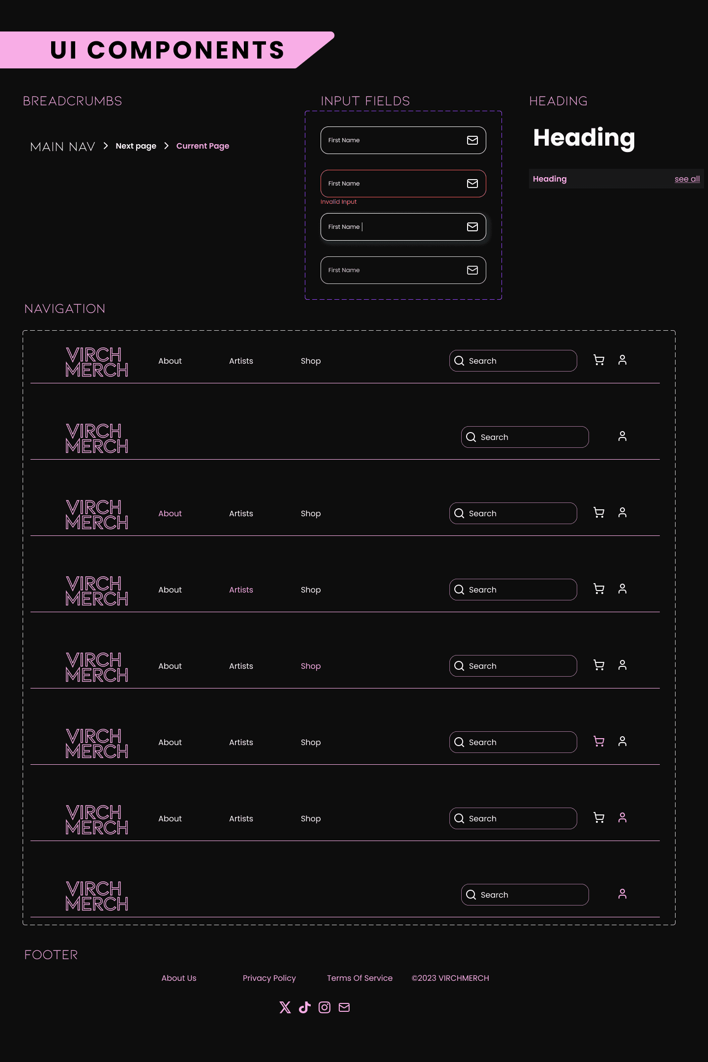 The Virch Merch team emphasized that we could take liberties with their branding, so we created a detailed style guide to illustrate our choices. We took inspiration from their competitors and other modern, gen-z/millenial centric music websites like Spotify when creating our components, choosing colors, and building typography.
