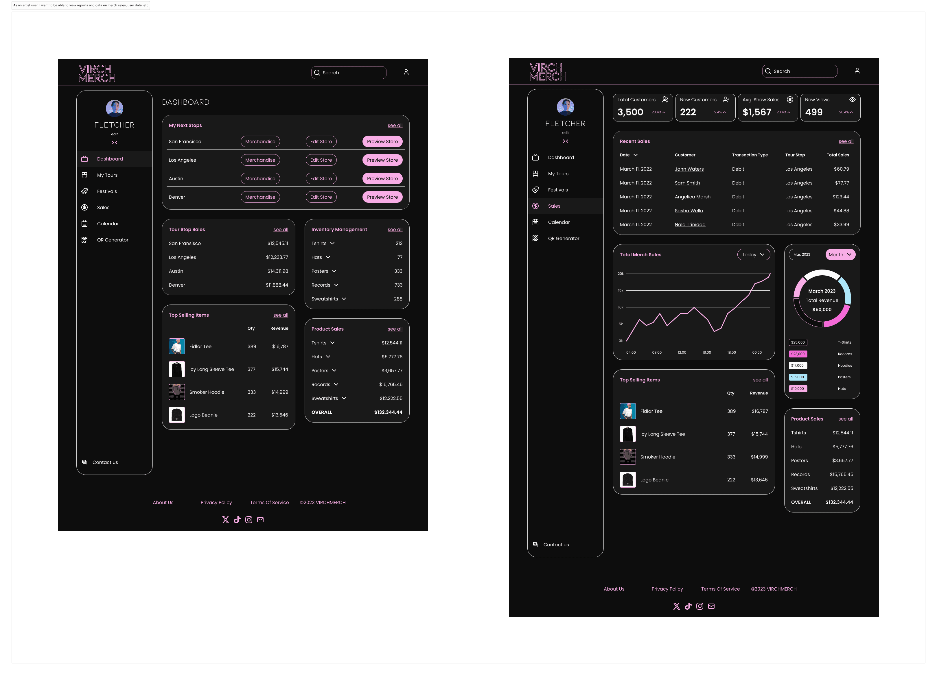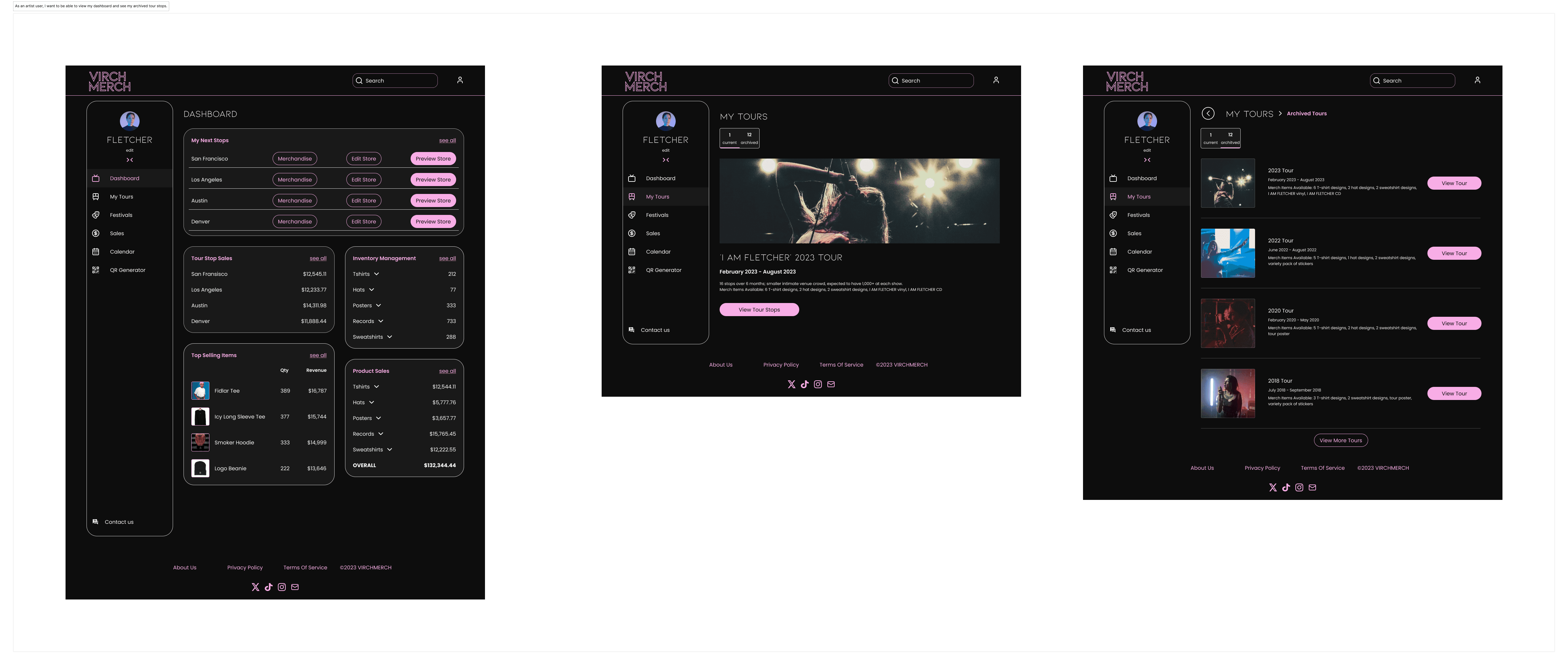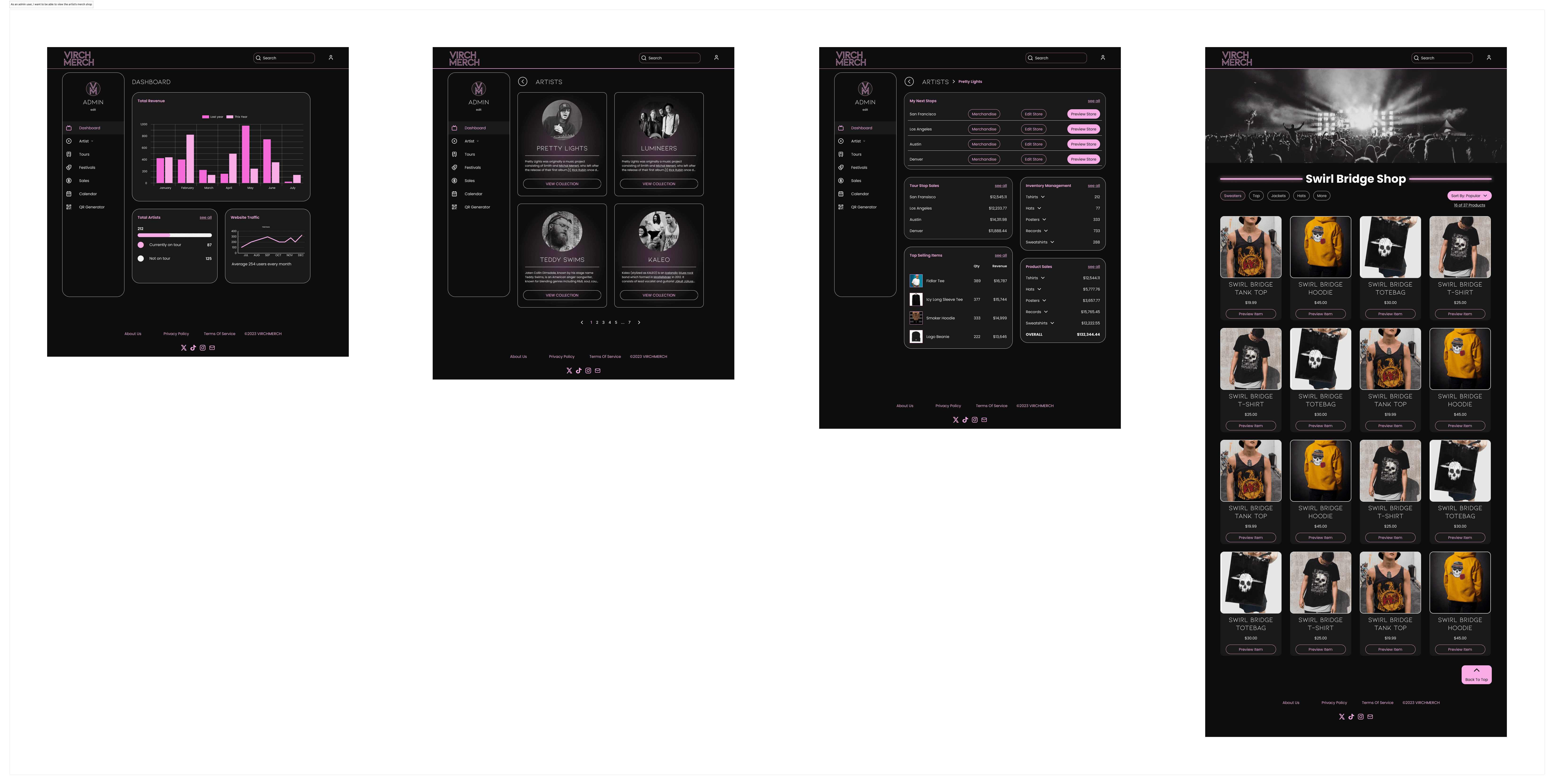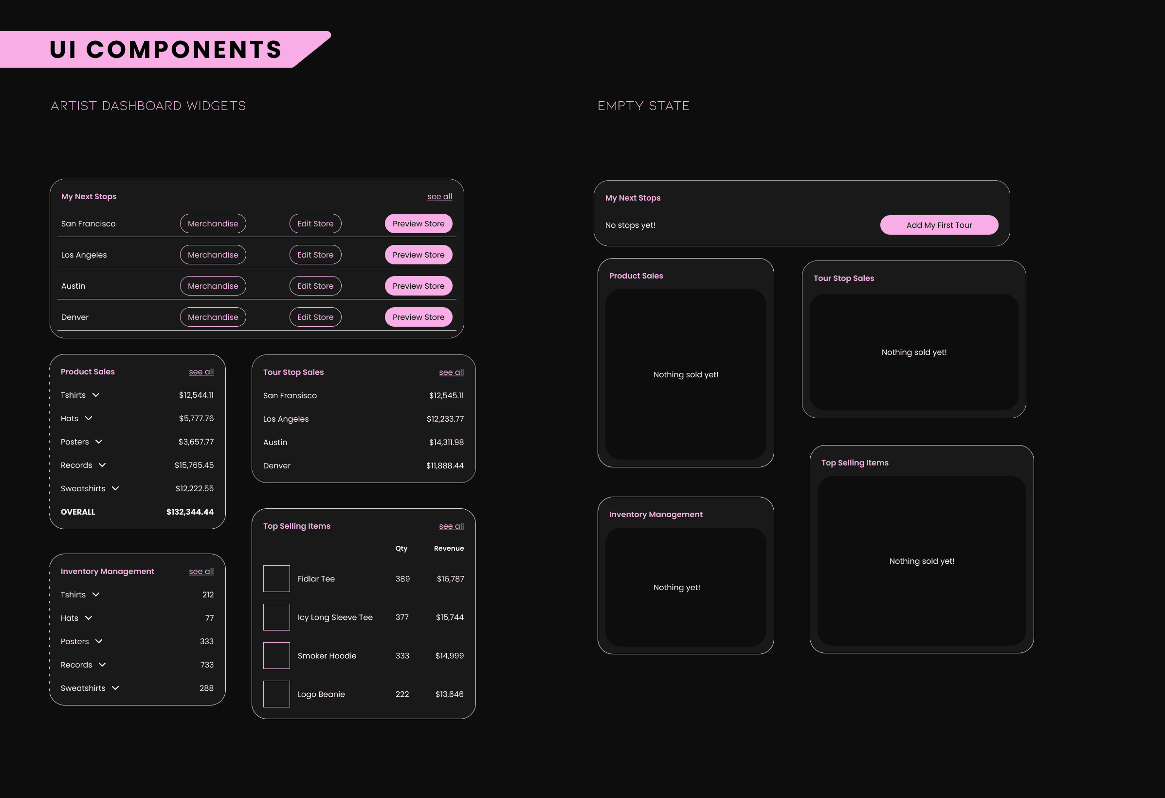 At this stage, we used the finalized landing page iteration as a reference for the visuals our hi-fi wireframes would have. My team and I focused primarily on building out the mid-fi wireframes we worked on previously, as we were familiar with them at that point, and lent support when needed. On the Artist Shop page, I designed product mockups to make the screen more faithful to a fully built-out shop. Since concerts are unlikely to sell a huge variety of merchandise to be on par with traditional retail e-commerce, I opted to allow users to scroll down and load sixteen items at a time instead of paginating the shops. Then they could come back to the top instantly with a "back to top" button. I also added a dropdown menu and tags to allow for simple sorting, with valuable insights from my team members to make sorting clear and remain consistent with the Artist Shop backend pages.