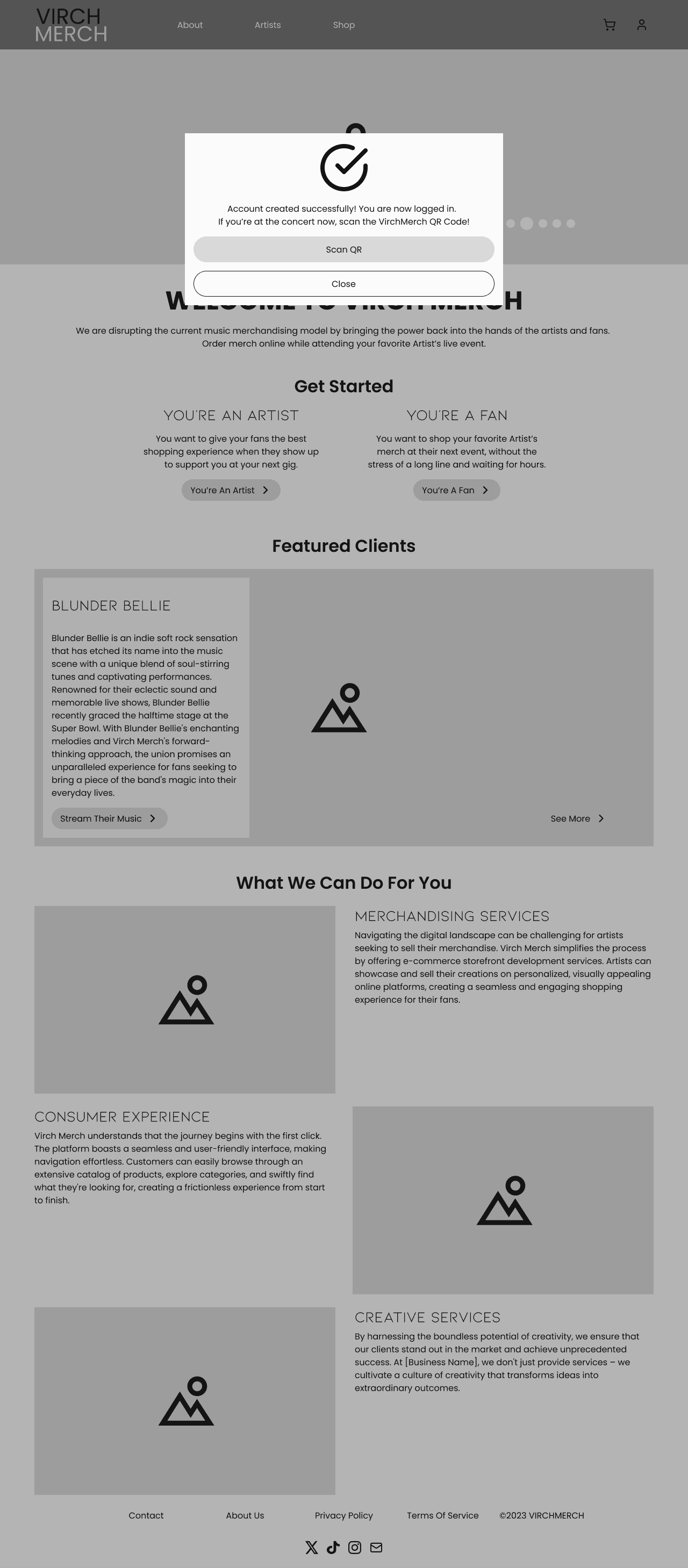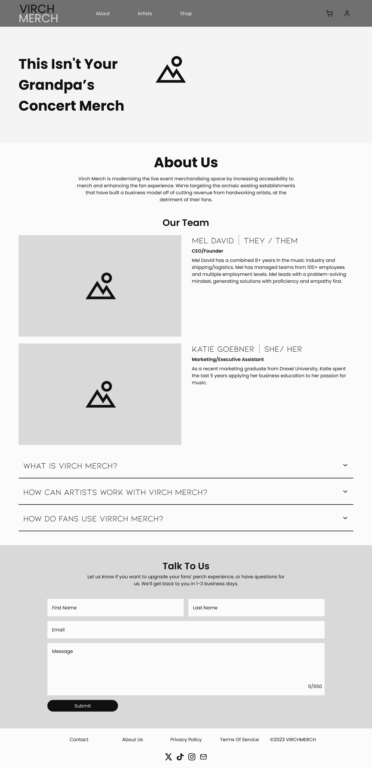 I also pushed to add a preview mechanic to the purchasing page, which would let customers take a quick look at the merchandise they were interested in while still enjoying the show. Finally, the About Page was made to give users a quick look at the team behind Virch Merch and offer more insight into the service, hence the FAQ and contact section.